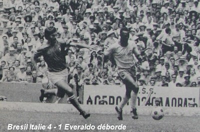 | 21 Juin 1970 Brésil bat Italie 4 buts à 1 (1-1) à Mexico 107 000 spectateurs Arbitre M. Glöckner (RDA) Buts Pelé 18eme, Boninsegna 37eme, Gérson 66'eme, Jairzinho 71eme, Carlos Alberto 87eme Brésil Félix - Carlos Alberto, Brito, Piazza, Everaldo - Clodoaldo, Gérson - Jairzinho, Tostão, Pelé, Rivellino Entraîneur : Mário Zagallo Italie Albertosi - Burgnich, Cera, Bertini (75eme Juliano), Rosato , Facchetti - Domenghini, De Sisti, Mazzola - Boninsegna (84eme Rivera), Riva Entraîneur : Ferruccio Valcareggi |